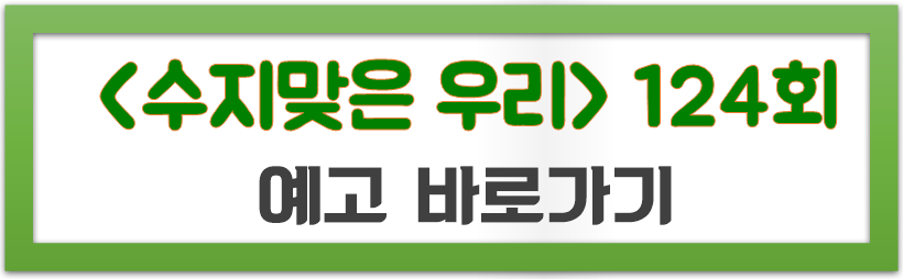 끝으로 곧 종영을 앞둔 <수지맞은 우리> 124화는 KBS 1TV에서. 10월 4일 오후 8시30분에 방송됩니다.